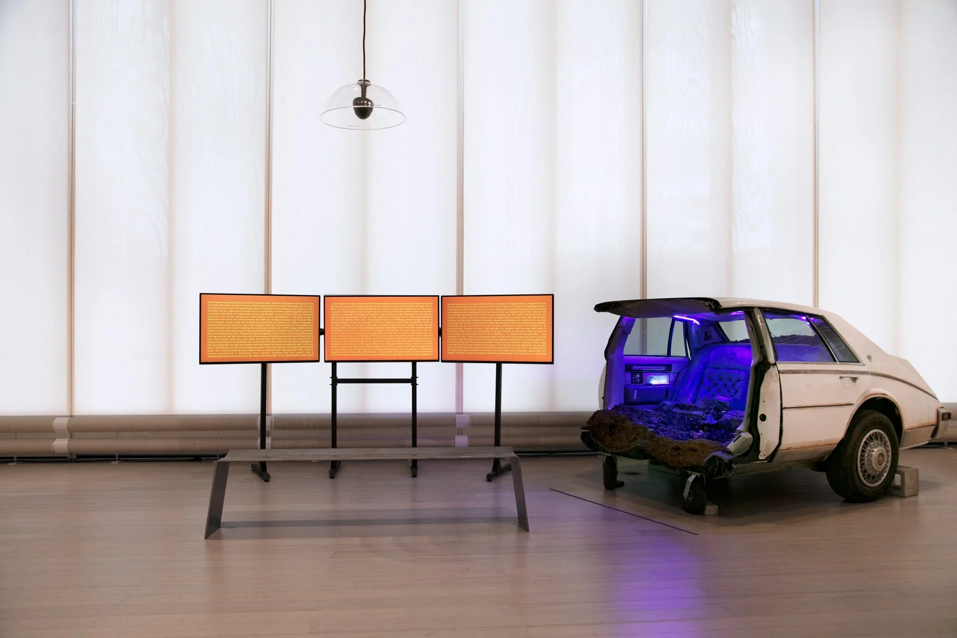 Left: history as hypnosis V.02, 2023, three-channel video, color, stereo sound, 30 minute loop; 42” monitors, monitor stand, metal seating. Right: history as hauntology V.01, 2023, severed Seville, casters, dirt, electronic parts, LED lights, 109”1 x 61”w x 65”h.